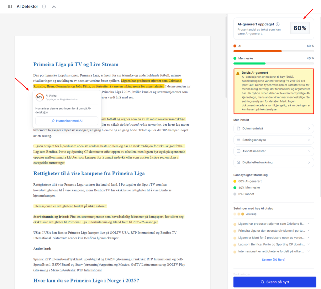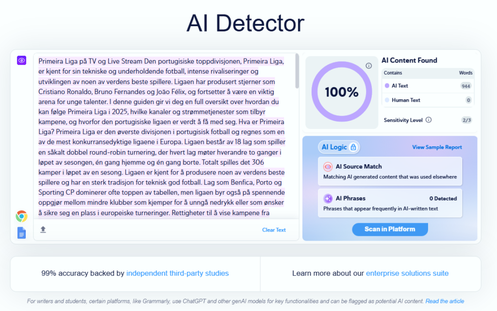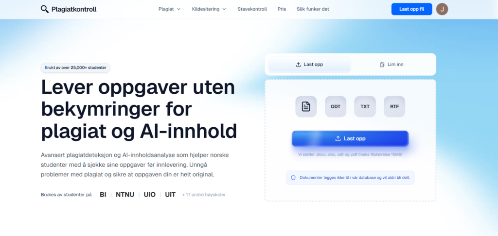 Verdt å merke seg er at plattformen også inkluderer en norsk AI detektor – en egen modell trent eksklusivt på norsk språk med omtrent 95 % nøyaktighet. Det gjør Plagiatkontroll.no til en komplett løsning for dem som trenger både plagiatsjekk og AI-deteksjon tilpasset norsk.